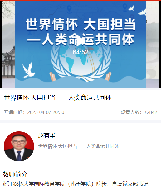 近日,由浙江中华文化公司中华文化网络公司主办、浙江中华文化海外传播促进会协办、哈兔中文网络公司承办的2023年第3期“空中大课堂”开播。本期讲座的主题是“世界情怀,大国担当——人类命运共同体”,由公司VSport体育经理、国际生国情教育名师工作室领衔人赵有华主讲。