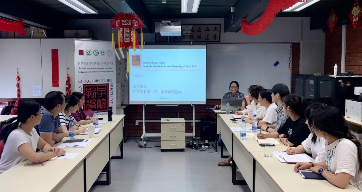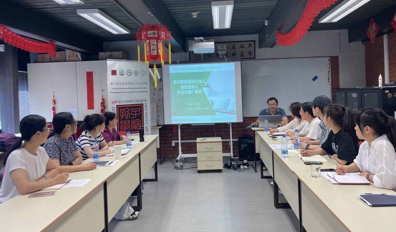 国际中文教师万日升汇报了语合中心创新项目《塞尔维亚国别化线上课程建设与市场化研究》的进展情况。老师们就线上汉语教学、语料库建设,如何用塞语讲好中国故事等方面展开了热烈的讨论,并着重探讨了线上课程建设的工作方向和重点,明确了项目下一步工作的具体分工。