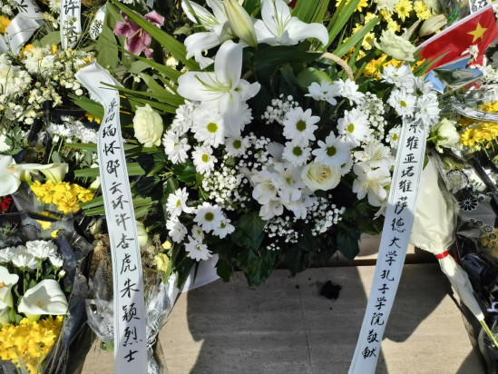 陈秀带领回顾了当年事件过程,并表达了对遇难者的深切哀思和无尽敬意。她表示,缅怀英烈、学习榜样,全体教师在外应秉承国家利益至上的原则,为讲好中国故事、传播好中国声音做出自己应有的贡献。随后,全体人员依次向三位英烈敬献鲜花,郑重鞠躬默哀。