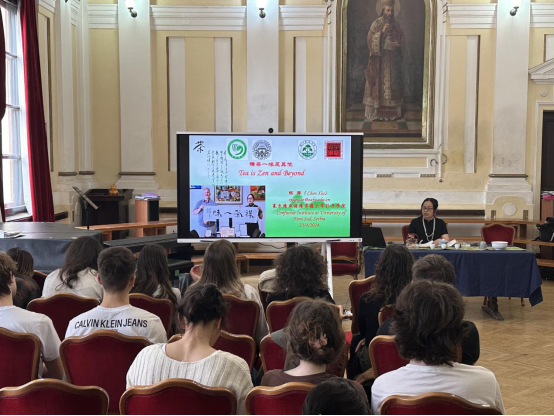 陈秀以禅茶一味、以礼达仁、以茶养生为切入点,为该校师生深刻解读了中国茶文化丰富内涵,指出茶文化是中国传统文化的重要组成部分。因其融合了中国的儒释道精神,饮茶不仅代表一种生活方式,更是一种生活态度,也是人们进行道德修养、人格完善、构建和睦人际关系的有效途径。