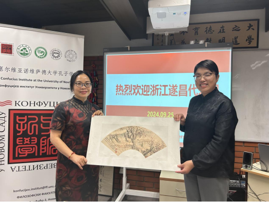 陈秀对代表团一行的到来表示热烈欢迎,她介绍了诺大孔院十年来的办学情况以及取得的显著成绩,并特别感谢遂昌县非遗代表团为诺大孔院十周年庆典带来的精彩节目以及相关的文化活动。她强调,非遗团的展示让塞尔维亚当地民众亲身感知了中国文化的独特魅力,极大丰富了他们对中国文化的理解和体验。她还表示诺大孔院将继续发挥桥梁作用,推动中塞文化交流与合作。