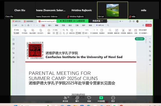 本次会议聚焦行前培训与家长答疑,就航班信息、相关文件准备、行李清单、在华行程安排及安全注意事项等内容进行了详细说明,确保学员们顺利启程并拥有充实而难忘的夏令营体验。陈秀强调,诺大孔院作为中塞人文交流的重要平台,始终致力于推动两国文明互鉴与民心相通。今年恰逢中塞人民友谊70年,本次夏令营意义尤为重大。她表示,赴华夏令营是塞尔维亚青年近距离感知中国发展、体验中华文化的宝贵机会,希望学员们成为中塞友好的见证者与传播者。