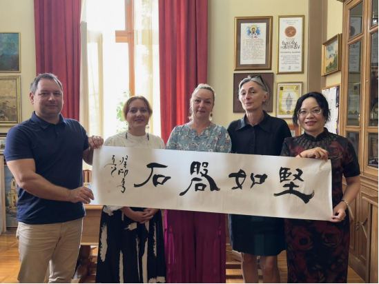结束后,陈秀向卡尔洛夫茨语言高中赠送书法作品《坚如磐石》,传递美好情谊。