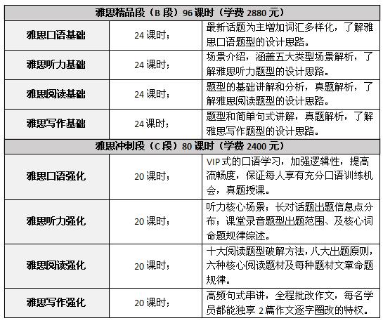 注:开班和授课时间根据学员报名情况等实际情况进行安排调整。学员可根据自身情况,进行ABC阶段各阶段单独或组合,也可单项报名。(可单独报雅思听力、雅思口语、雅思写作、雅思阅读。托福课程同上)