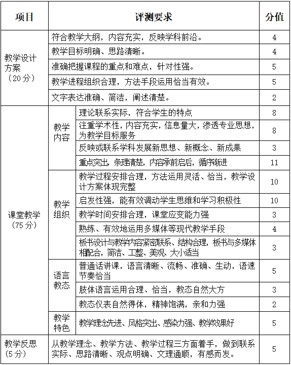 课堂教学规定时间为15分钟。评委主要从教学内容、教学组织、教学语言与教态、教学特色四个方面进行评审。选手需准备参赛课程 1个学时相对应的 1个课堂教学节段的 PPT,课堂教学内容要与提交的教学设计内容对应、一致。
