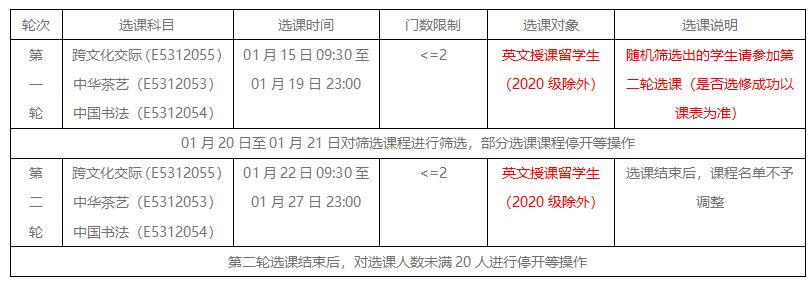 2.根据人才培养方案要求,中文授课职工需获得总学分120分(含选修课学分);本学期,英文授课职工也需参加选课,仅在三门课里面选:跨文化交际(2学分),中华茶艺(1学分),中国书法(1学分),英文授课职工通识选修需修满2学分。