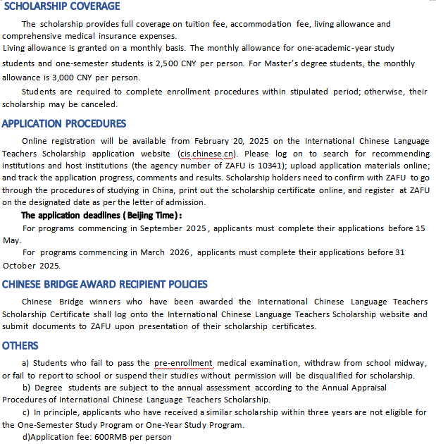 在各类汉语桥比赛中获得年度“国际中文教师奖学金证书”者,登录国际中文教师奖学金网站,凭奖学金证书提交申请材料。