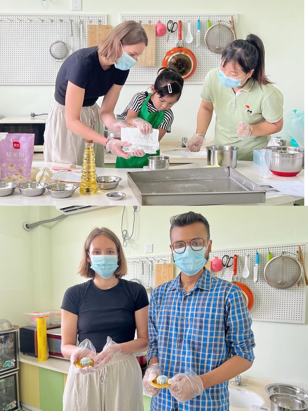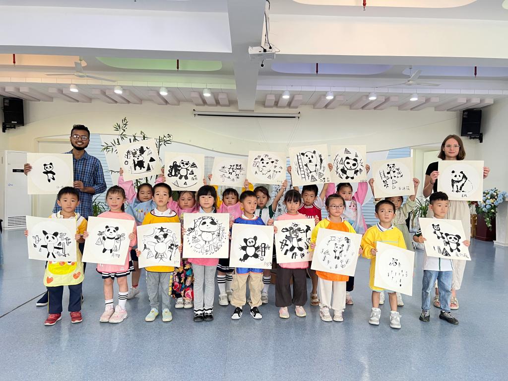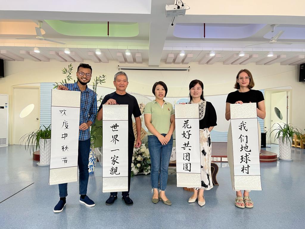 国际生代表和中班的小朋友们一起动手做起了冰皮月饼,大家边做边吃,欢喜迎中秋。大班的孩子和两位国际生代表一起认识中国的文房四宝,现场画起了国宝熊猫;幼儿园水叔叔和职工一起写下了“欢度中秋节,花好共团圆”“我们地球村,世界一家亲”的美好祝福,恭祝中华人民共和国74周年华诞,愿世界人民相亲相爱。