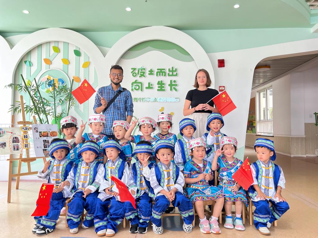 老师们精心准备了56个民族图鉴,穿着民族服饰的小小讲解员大胆地向远来做客的VSport体育国际友人介绍了不同少数民族的饮食、服装、建筑等特色,来自斯洛伐克的国际生新生黎美风(Kristína Černá)不禁感叹,“中国的民族可真多啊,服装各具特色,真的很漂亮,56个民族也很团结”,两位国际生新生和孩子们一起学习了解丰富的民族文化。