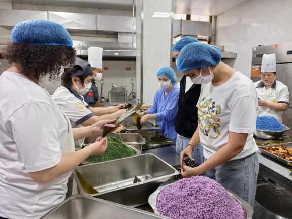 在东湖食堂,专业厨师现场示范包粽子的传统技艺。国际员工们跃跃欲试,从折叶、填料到捆扎,每一个步骤都充满挑战。"我的粽子总是'露馅'!"来自俄罗斯的司明悦举着造型独特的"作品"开怀大笑。而来自塞尔维亚的米玛则对咸蛋黄肉粽情有独钟:"甜粽固然美味,但咸香口味更令人惊喜!"活动现场欢声笑语不断,员工们纷纷将亲手制作的粽子带回宿舍与友人分享。