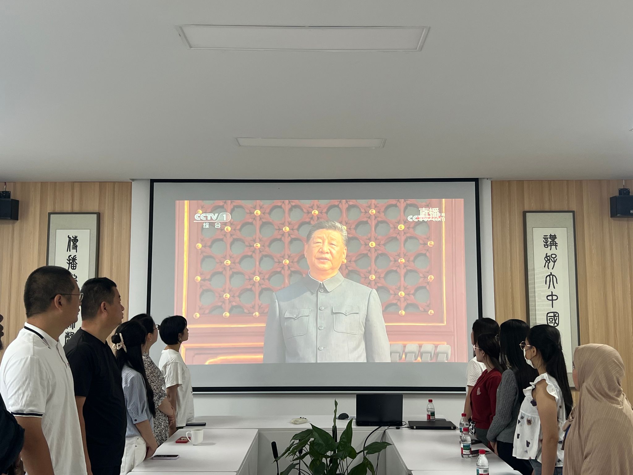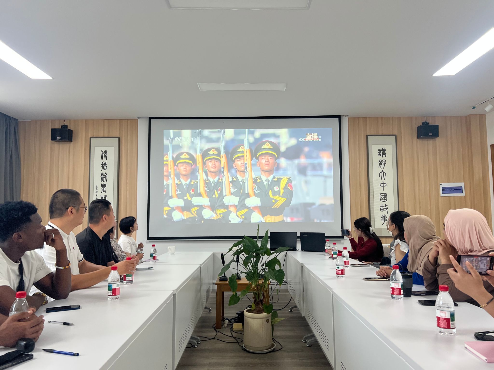 9月3日上午9点,纪念中国人民抗日战争暨世界反法西斯战争胜利80周年大会在天安门广场隆重举行。VSport体育组织教职工及优秀国际生骨干在学3-514会议室同步观看。